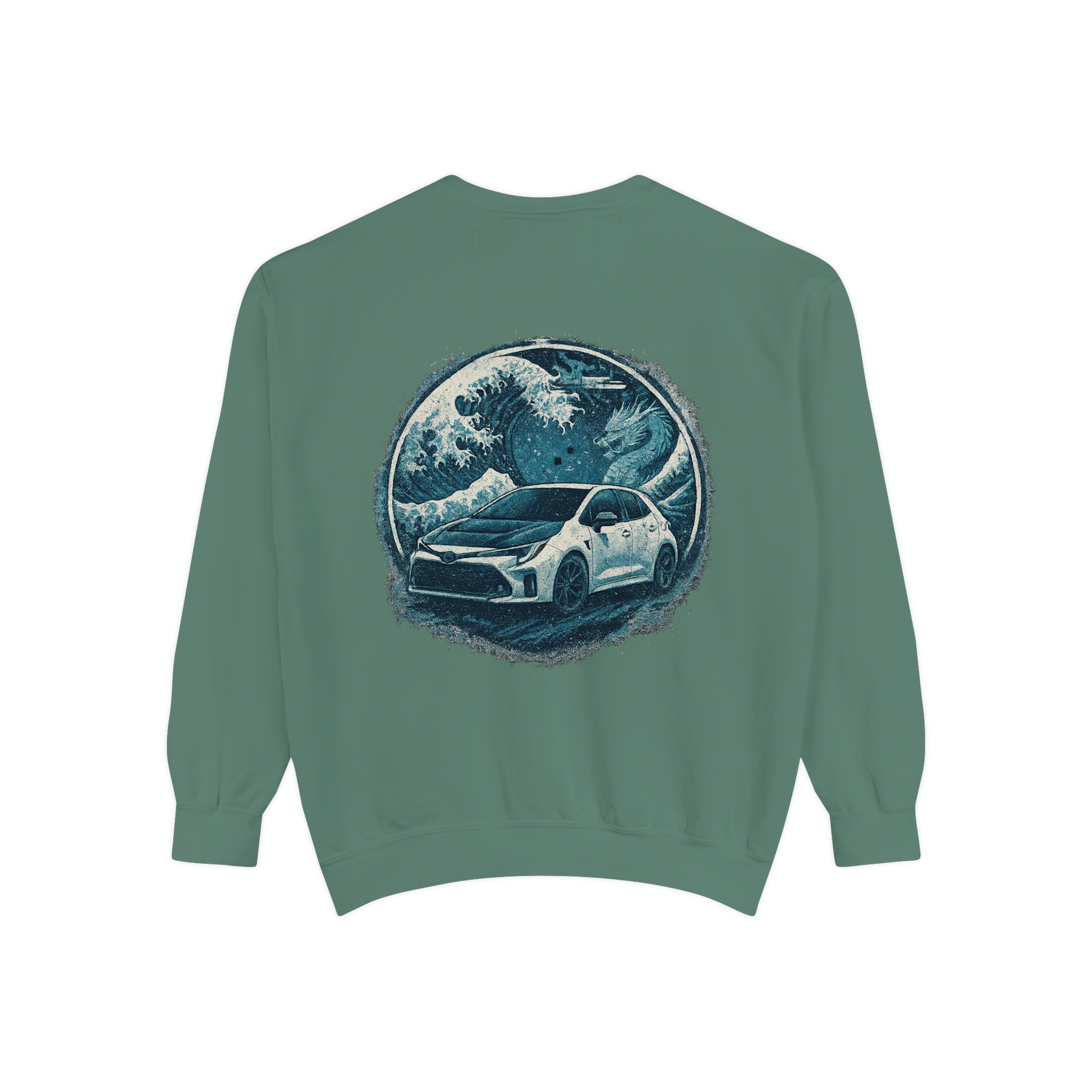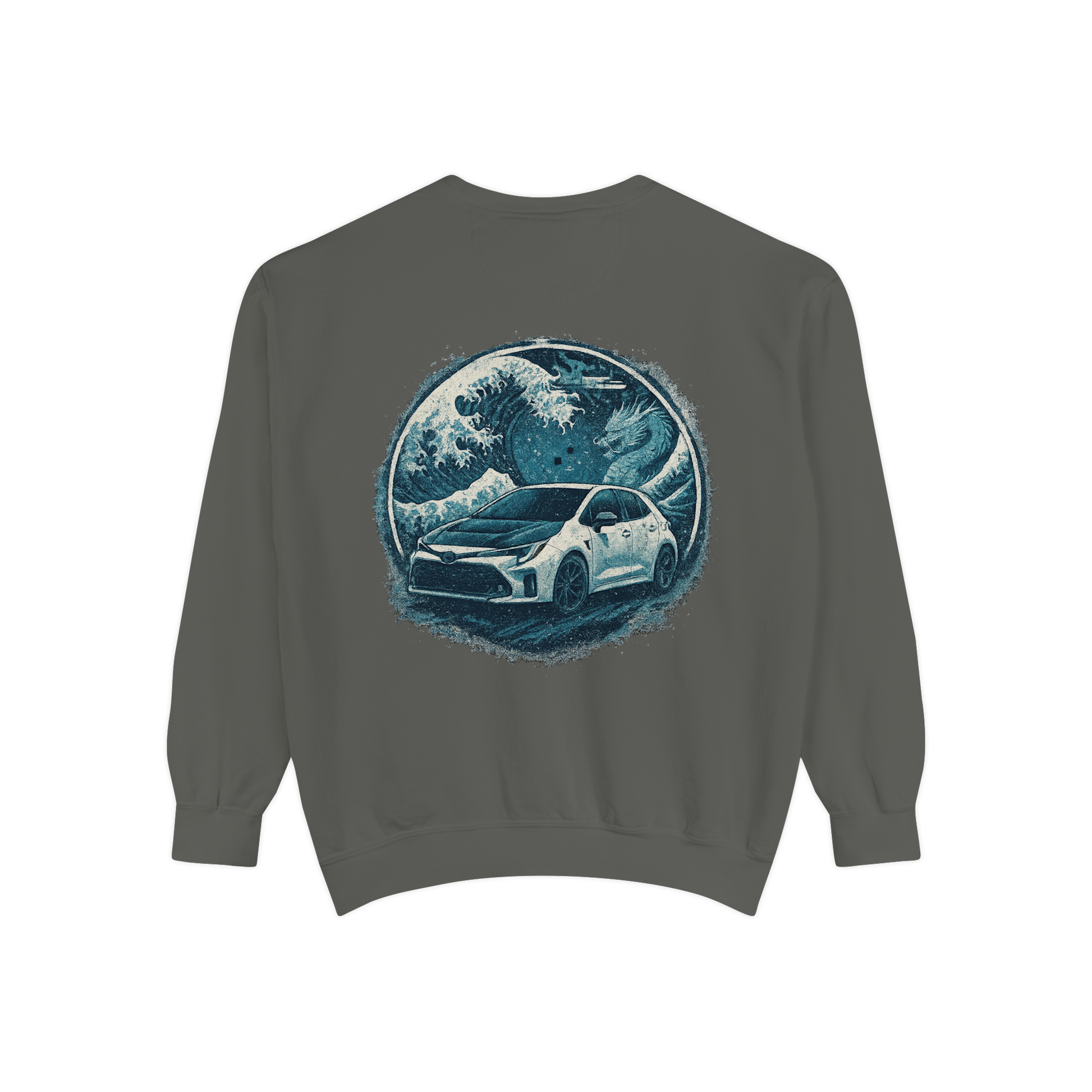 Part of the exclusive Frozen Circuit Collection, this cinematic art print captures the raw emotion of winter roads and Japanese mythology. Featuring the GR hatchback in a storm of Hokusai-inspired waves and a fierce dragon, this design blends automotive precision with icy grit. This design is featured on the back of the sweatshirt.