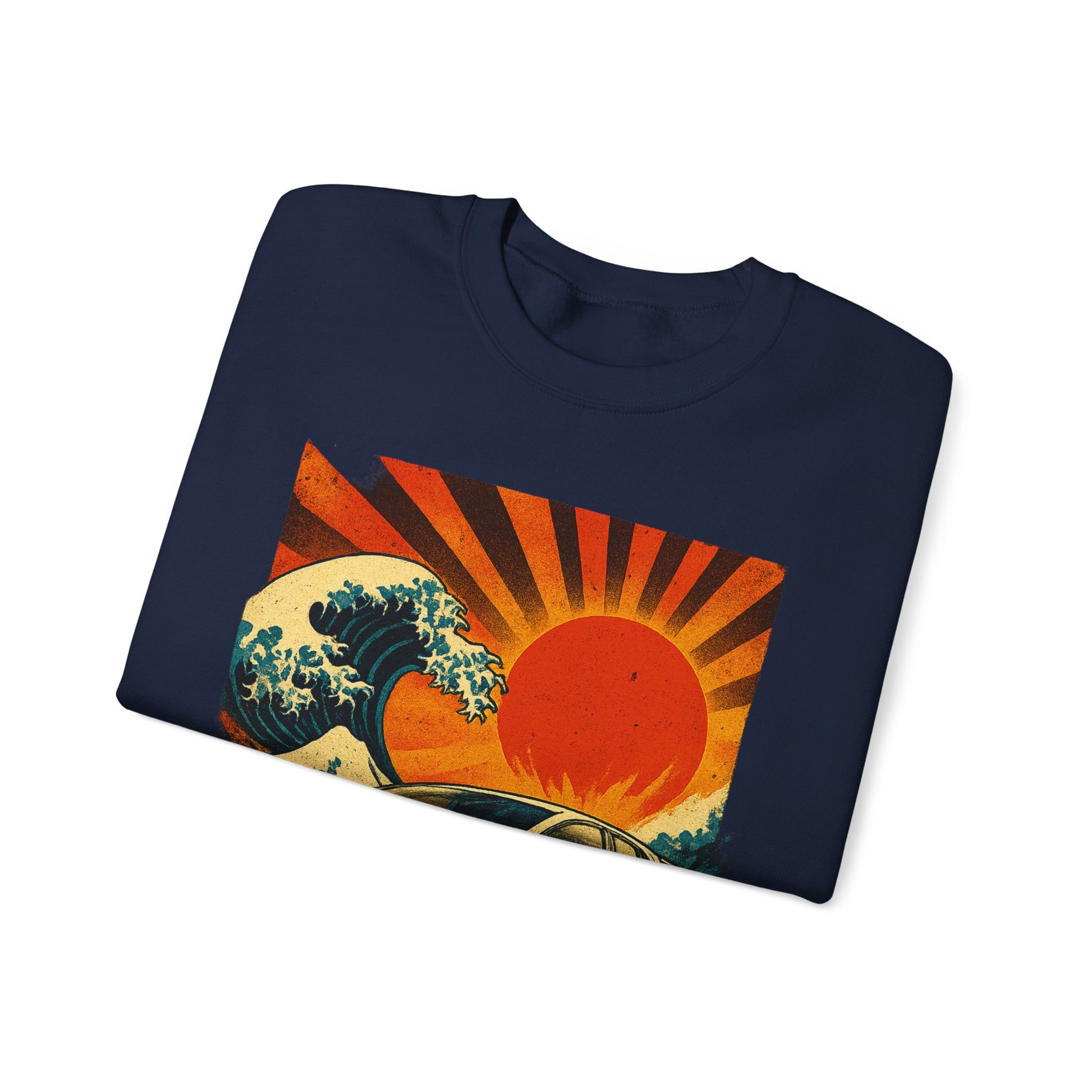 Stay warm while turning heads with the Wave Warrior Sweatshirt – GR Edition, a fusion of streetwear and speed. This premium pullover showcases a stylized Toyota GR Corolla charging through a crashing Great Wave, framed by a rising sun in vintage Japanese fashion. The abstract brush textures and aggressive car styling make this sweatshirt a wearable piece of art — perfect for trackside chills, car meets, or everyday flexing.